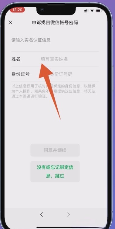 跳转到下一个页面后,填写自己的身份信息,点击同意并继续。