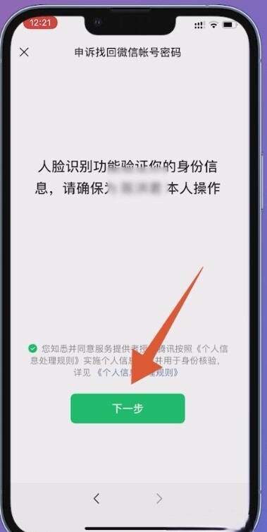 跳转到人脸识别的页面后,勾选同意,点击下一步,进行人脸验证。