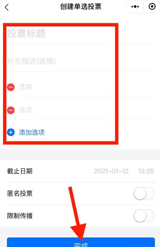 4、在创建投票页面中,输入投票标题和内容,选择截至日期,点击“完成”。