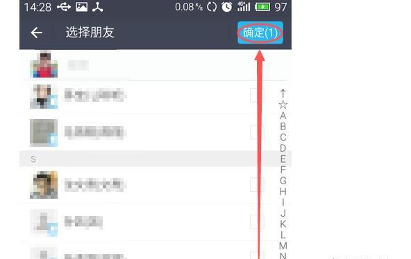 4、点击该红包后,我们就要选择发送红包的好友了(也可选择多名好友),选择好之后点击右上方的“确定”。