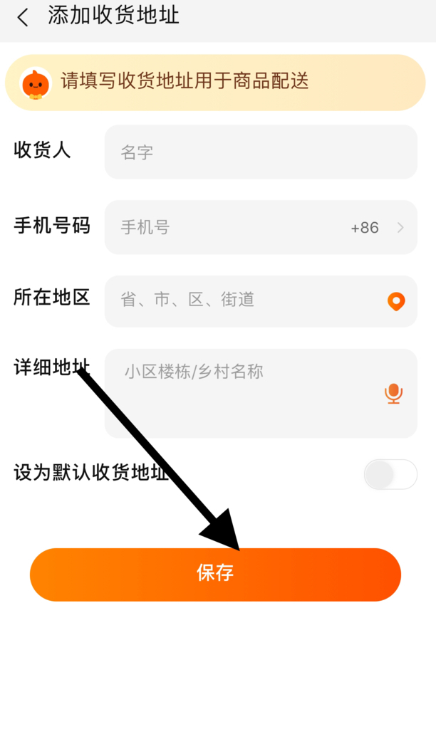 4.进入添加收货地址页面,输入想要更改成的地址,点击保存图标