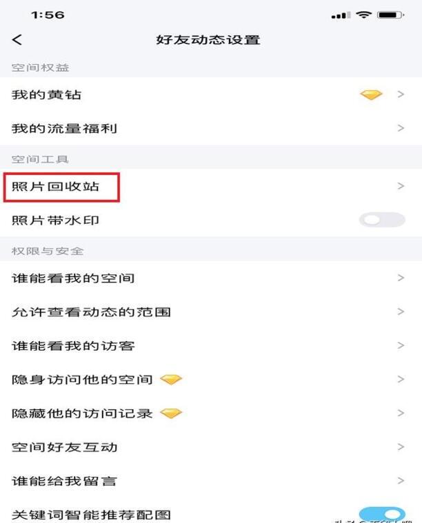 第五:点击打开好友动态权限设置,找到照片回收站。