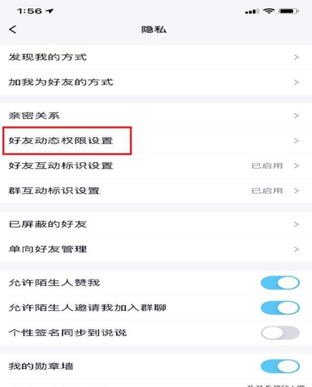 4、进入隐私后,会看到【好友动态权限设置】,点击进入。(安卓用户也是同样操作)