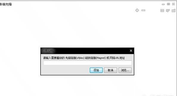 4.比如我们点击打开URL,如下图所示,就会出现一个输入框,可以将先锋链接或是磁力链接复制粘贴进来,点击添加,还可以浏览添加链接。