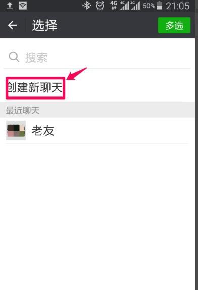 6、在选择好友界面,点击“创建新聊天”功能。如图所示: