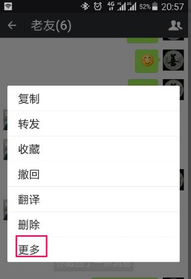 2、在聊天窗口界面,长按某条消息不放就可以弹出功能菜单。如图所示: