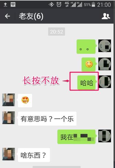 第二:点进和这个人或者群的聊天记录后可以看到具体的聊天信息,随便找到一条消息,按住3秒钟。