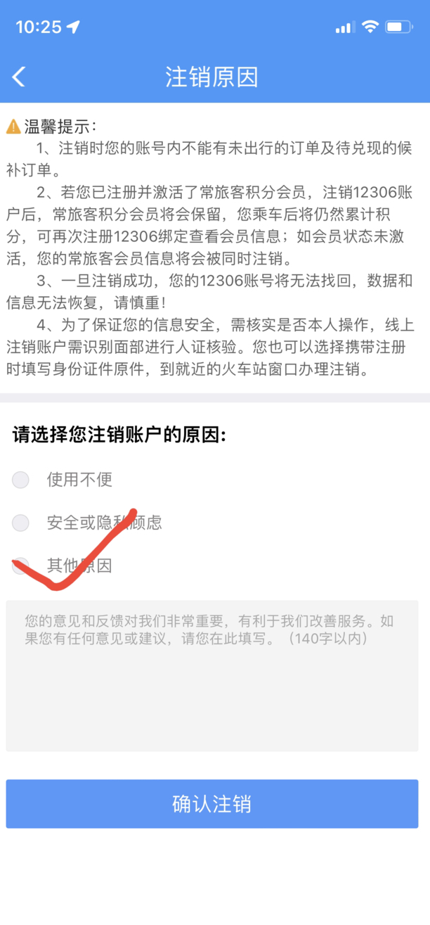第五:点击注销账户后,在注销原因页面选择原因,然后点击确认注销。