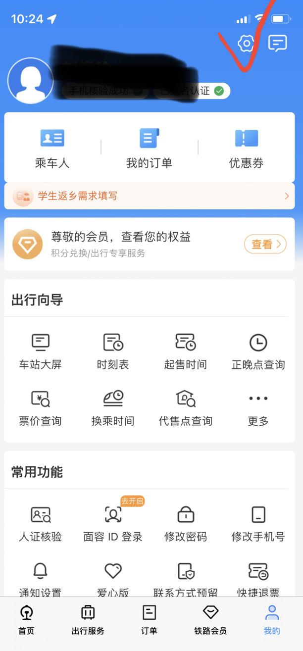 第三:然后在我的12306页面,点击姓名后面的三角打开。
