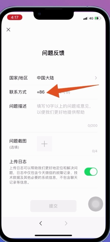 页面输入你的联系方式、问题描述、无法登录微信的问题截图。