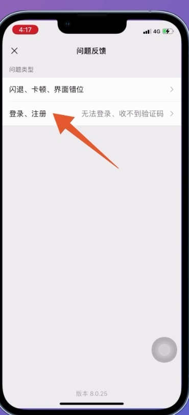 翻转进入问题反馈页面,页面选择登录、注册这一选项点击。