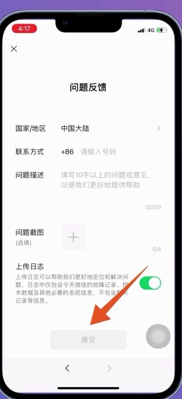 页面点击开启上传日志,点击提交,即可等待微信官方解决因微信系统原因导致的微信登录失败。