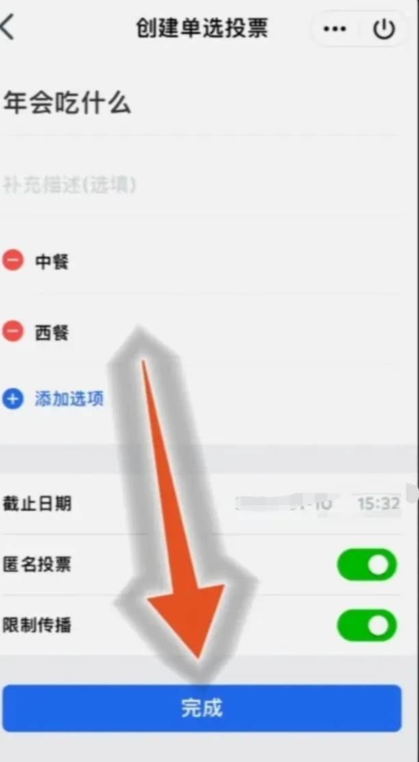 步骤8、如下图所示,设置好投票的信息后,点击“完成”按钮,就可以发起QQ群投票。