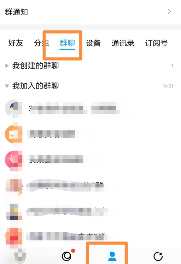 第一:打开手机qq登录账号点击联系人找到新建的群进入群。