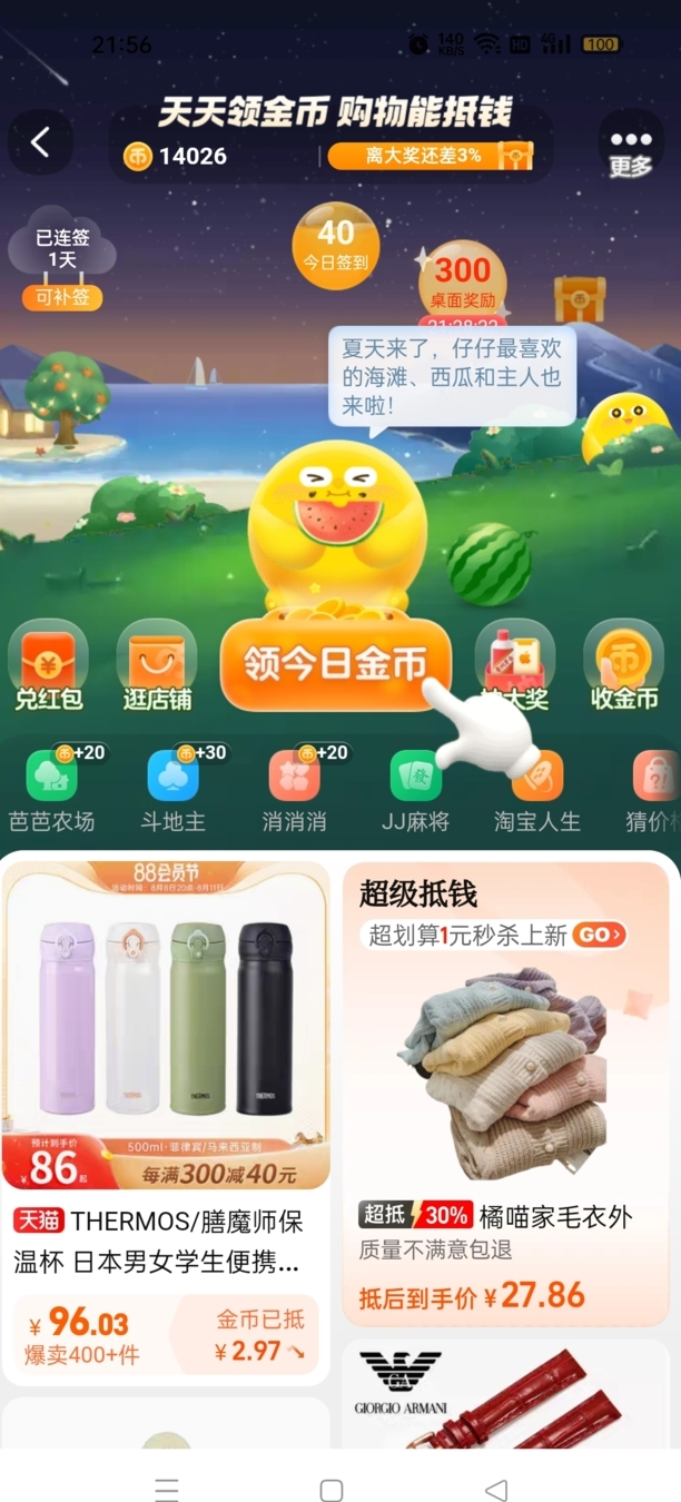 2、然后可以点击领取今日金币,淘金币要每天记得领取,积少成多,以后有需要时就不慌了