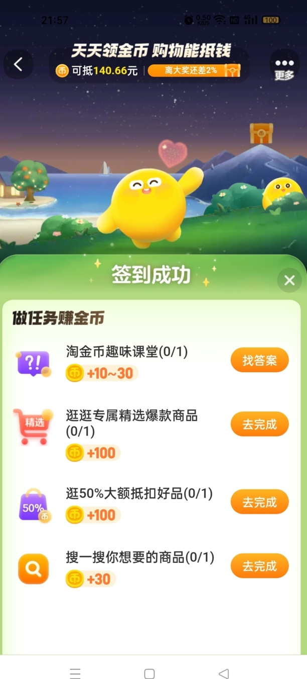3、领取当日淘金币后,我们还可以通过完成任务,获取更多的淘金币