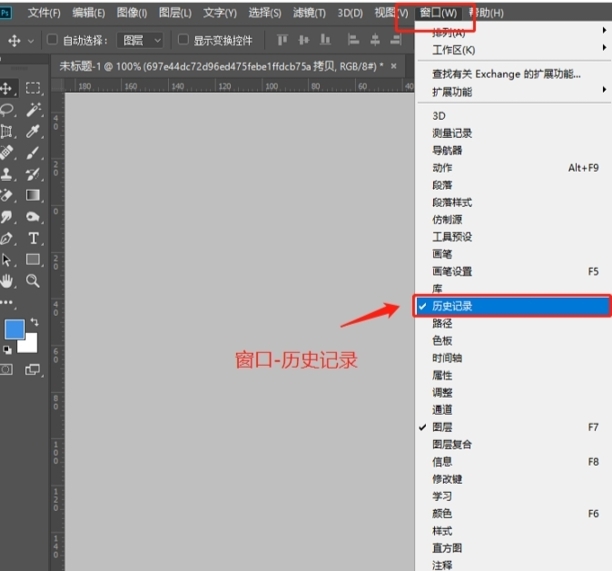 步骤1、方法一:我们可以通过历史记录来进行撤销,菜单栏窗口-历史记录;如下图所示: