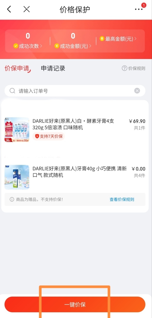 4、选择需要保价的订单,点击"一键保价"申请就可以了。