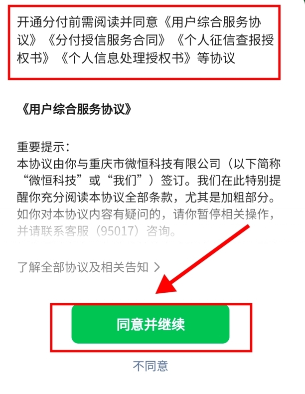 5、阅读开通分付的相关协议,点击“同意并继续”,根据页面提示便可开通分付