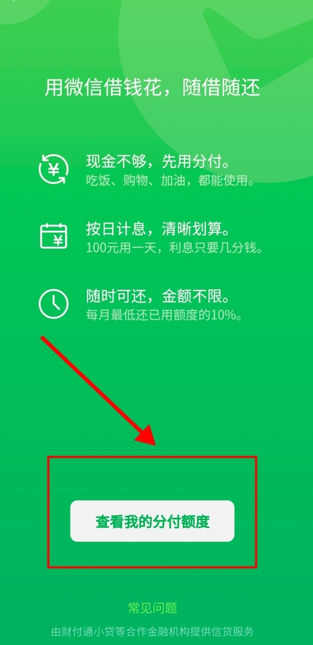 4、知晓微信分付的相关服务功能,点击“查看我的分付额度”;