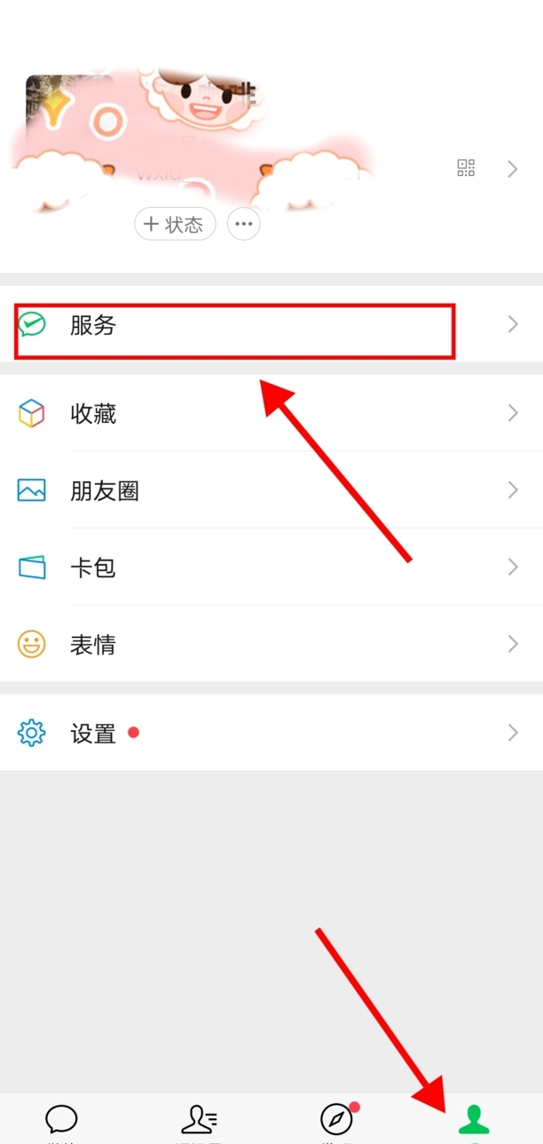 1、打开手机微信,点击右下角的“我”,选择“服务”进入;