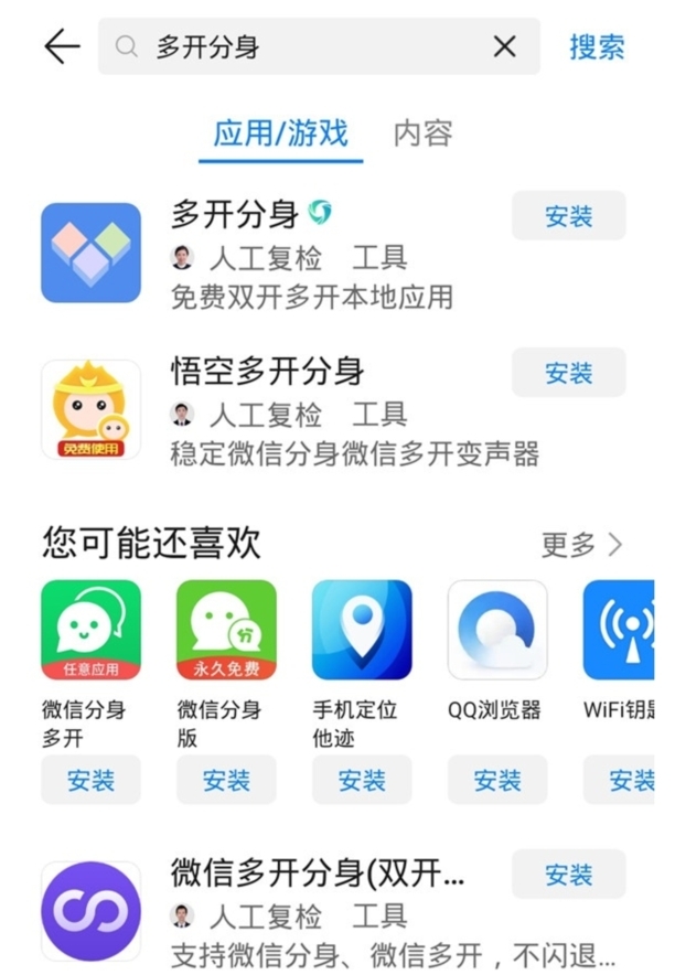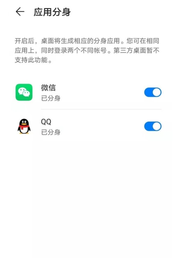 华为手机系统自带的应用分身仅支持微信和QQ,如果想分身其他应用,可以在华为应用市场下载第三方分身软件使用。