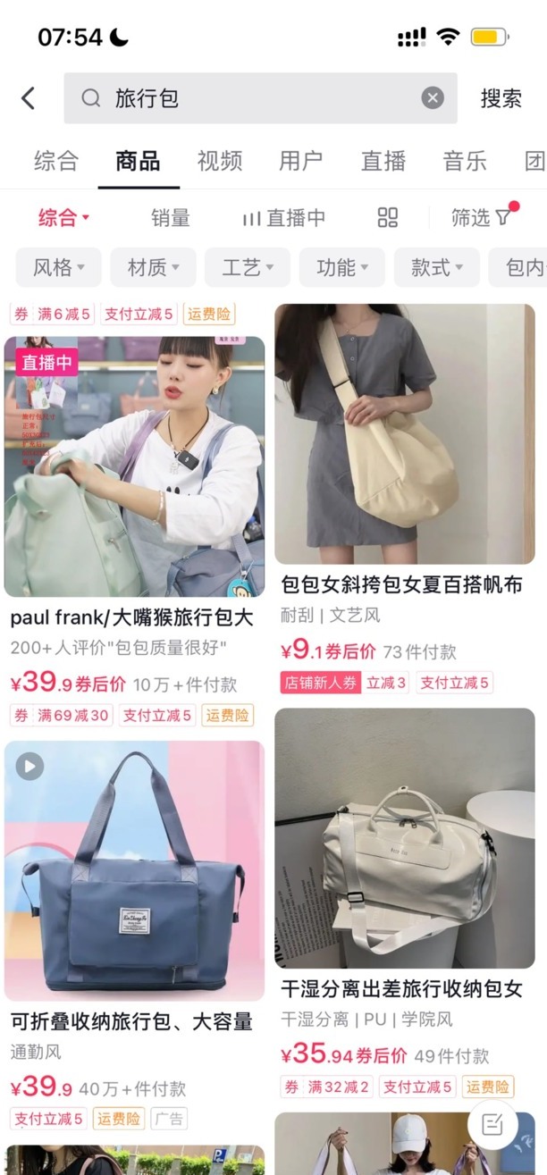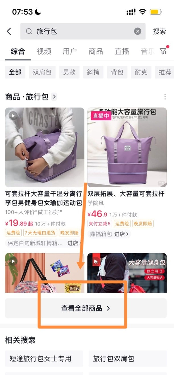 2、收索你喜欢的物品,以旅行包为例,点击全部商品,点击你喜欢的商品