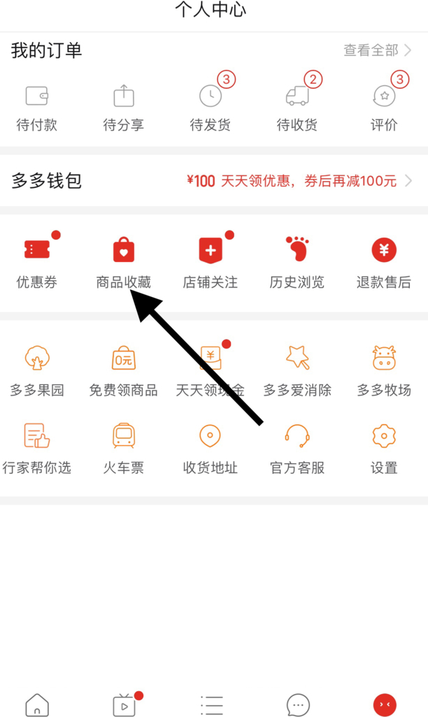 1.打开拼多多,在个人中心页面,找到 商品收藏 图标,打开