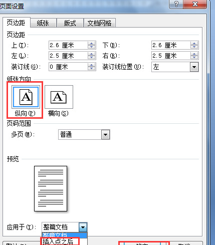 4、将纸张方向设置为纵向,在应用于处选择“在插入点之后”,点击确定。