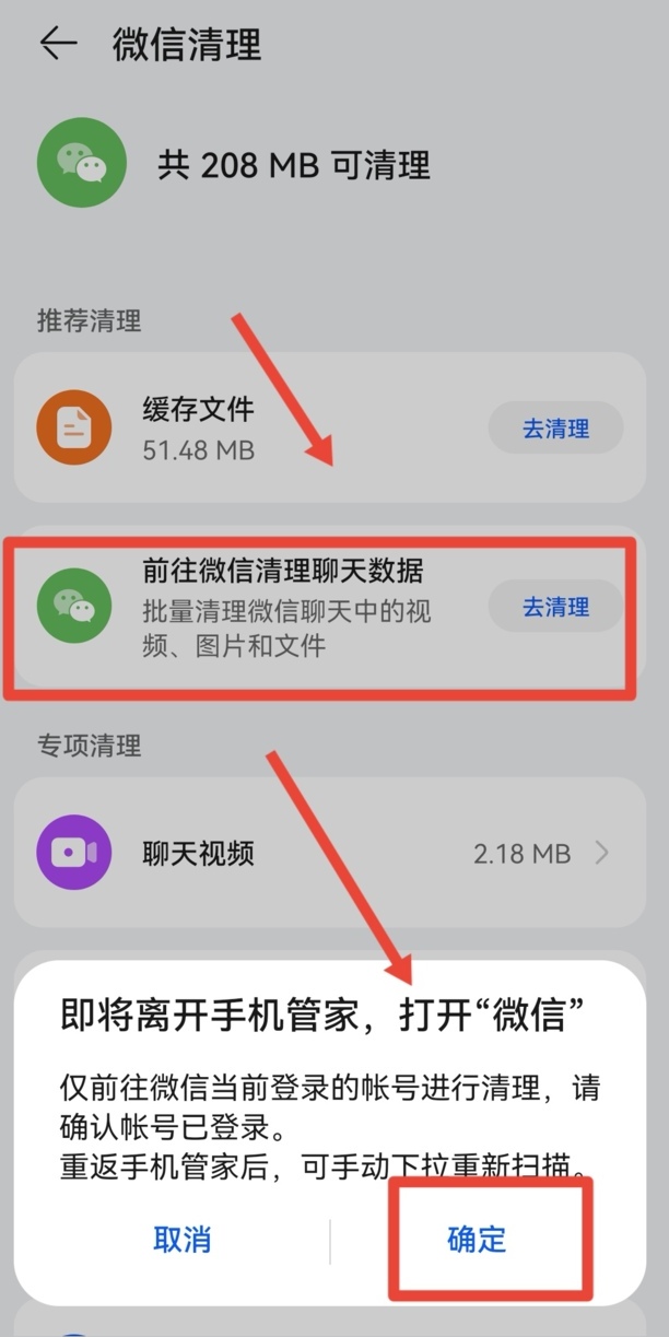 6、再点【前往微信清理聊天数据】,点【确定】