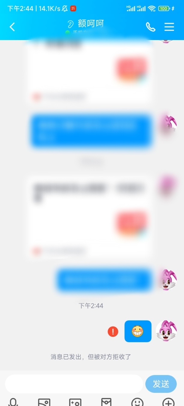 3、如果消息前面有感叹号并且显示消息送达但被对方拒收,说明对方屏蔽了你