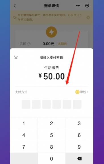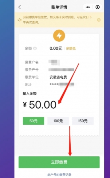 步骤5、在账单详情界面,输入金额并点击立即缴费。