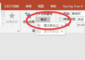 第三:点击动画栏目中的“触发”选项,在其下拉菜单中选择“通过单击”。