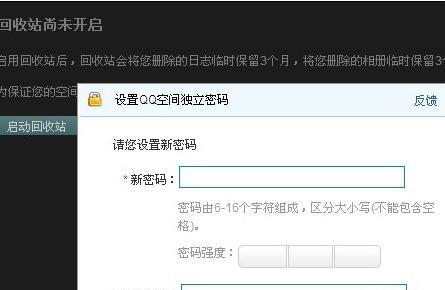 2、如果空间还没有设置密码的朋友,点击“日志”,弹出的页面提示你开启回收站功能,开启回收站后,你删除的邮件,QQ空间将为你保存三个月。或者直接输入你的QQ空间密码。我们点“启动回收站”,弹出对话框要我们设置密码。我们输俩遍后,点确定。但是这密码不能和QQ密码相同。