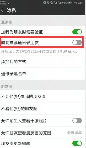 5、将“向我推荐通讯录朋友”后面的滑块关闭,就取消了手机联系人和微信联系人同步