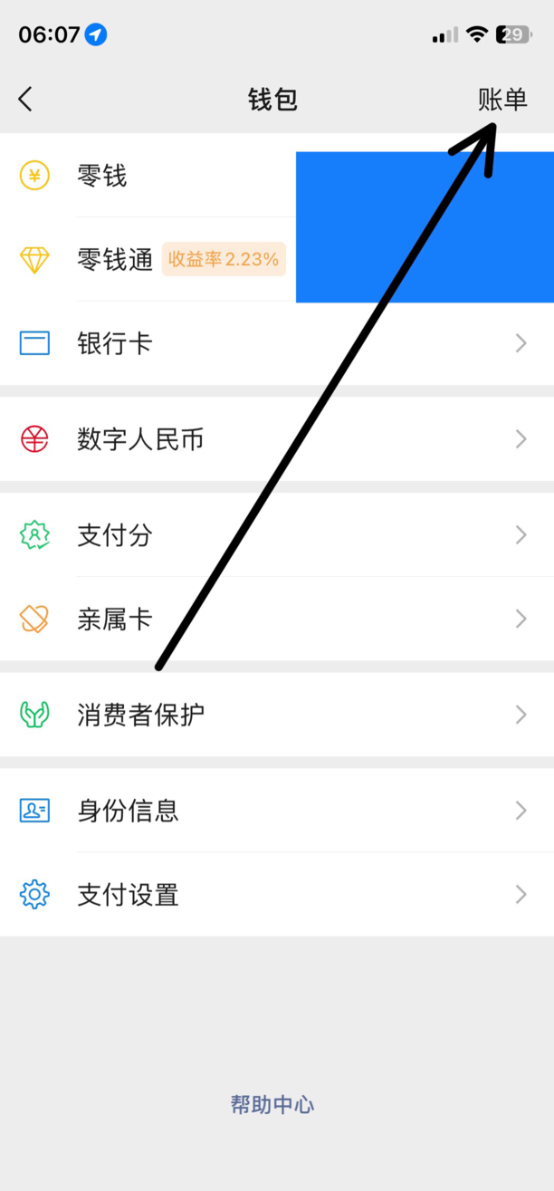 第三:进入钱包后,打开右上角的账单;