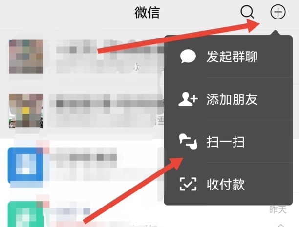 9、使用第二台设备再次登录同一个微信账号,打开后,点右上角【+】,再点【扫一扫”】。