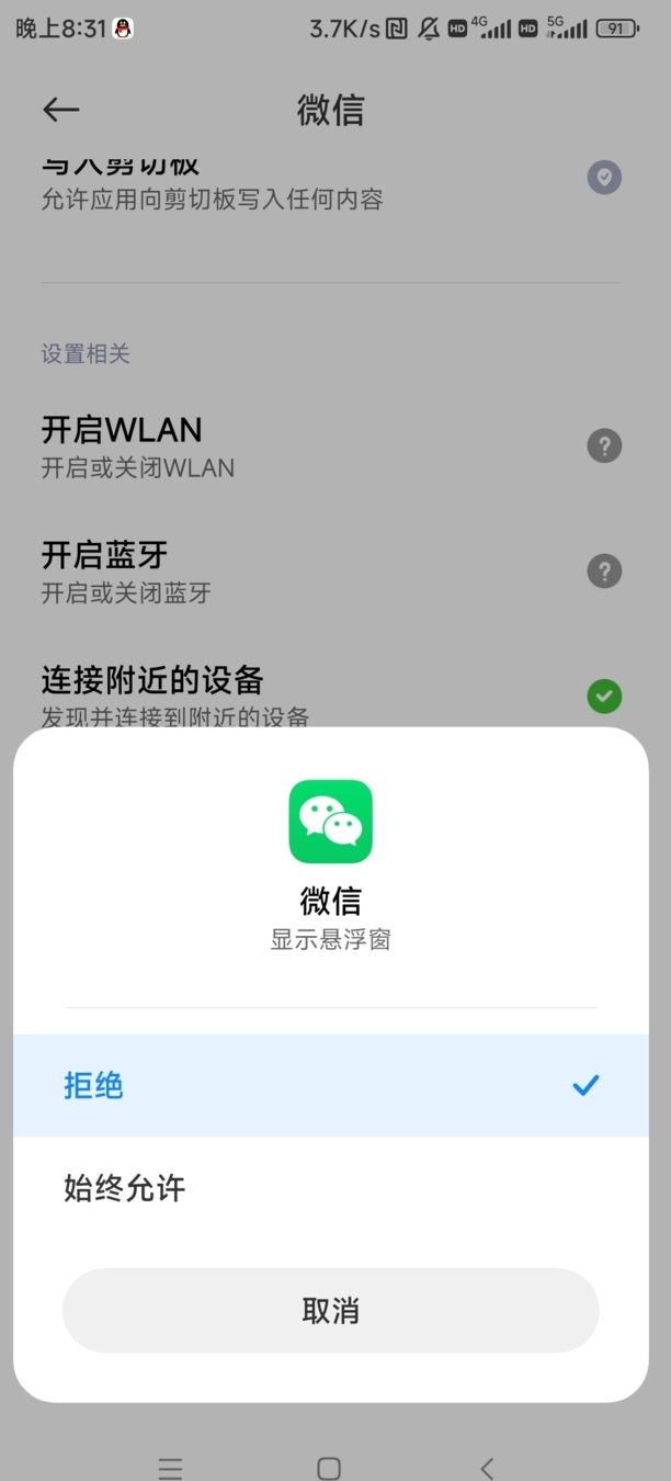 3、最后点击显示悬浮窗选项,在弹出的窗口当中,点击拒绝选项。