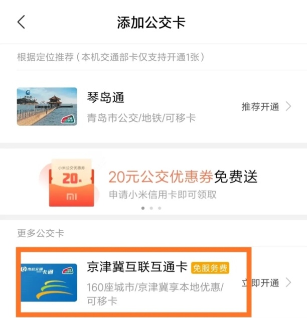 第三:设置自己的公交卡,只需点击公交卡的立即开卡按钮,这时手机界面会出现各个支持NFC公交卡的城市卡片,如果你的手机开启了自动定位功能,则手机会自动为你推荐本城市的公交卡,免去搜索的麻烦。