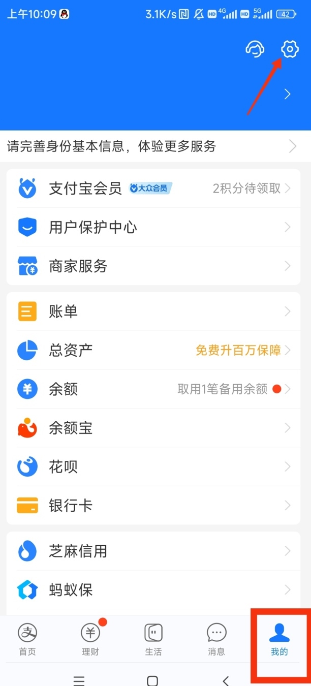 首先打开支付宝,进入我的页面,点击右上角的设置图标。
