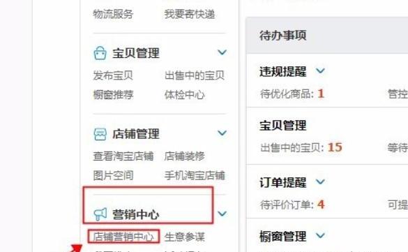 第二:登录后点击【卖家中心】,在左边的导航栏中间找到【淘宝营销中心】,点击进入。