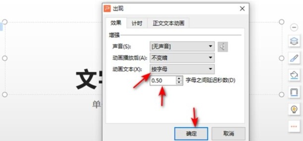 6、动画文本处选择按字母,然后在下方设置每个字母出现的时间间隔,最后点击确定,这样文字的动画效果就变成一个一个弹出了