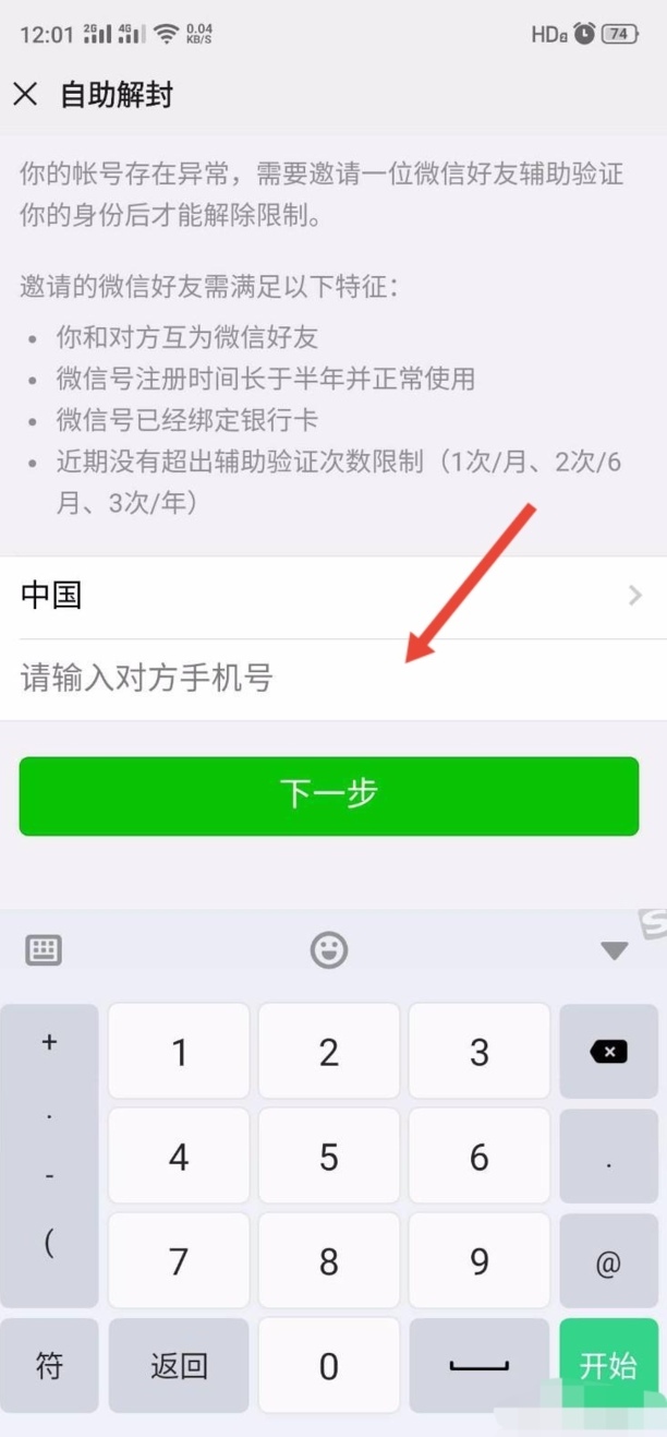 4、进入到这个界面后,我们可以输入一个亲戚或好友的手机号码,申请解封求助(切好友的该手机号要满足图上的要求),然后点击下一步。