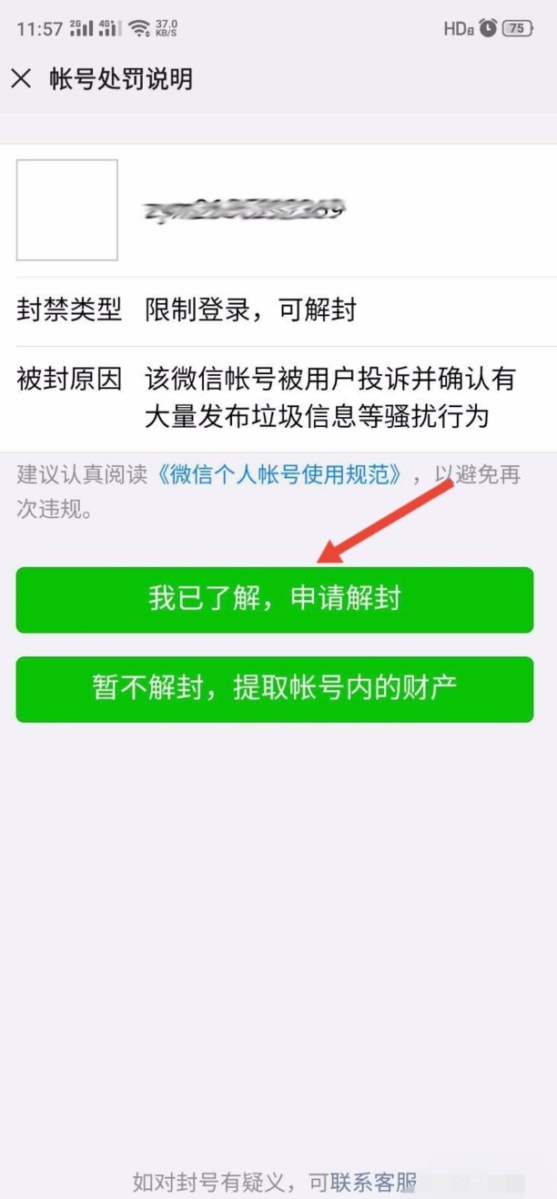 3、在这里我们可以看到被封禁的原因,显示可以解封。点击我已了解,申请解封,