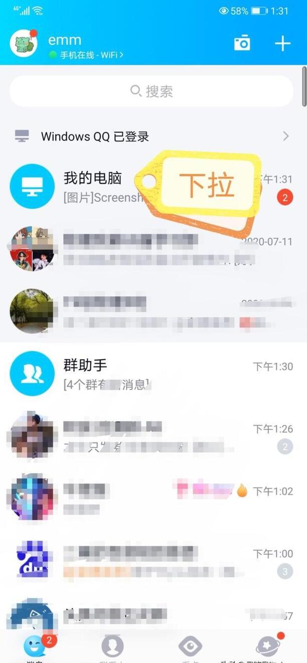 打开QQ,进入QQ页面后,按住屏幕往下拉。