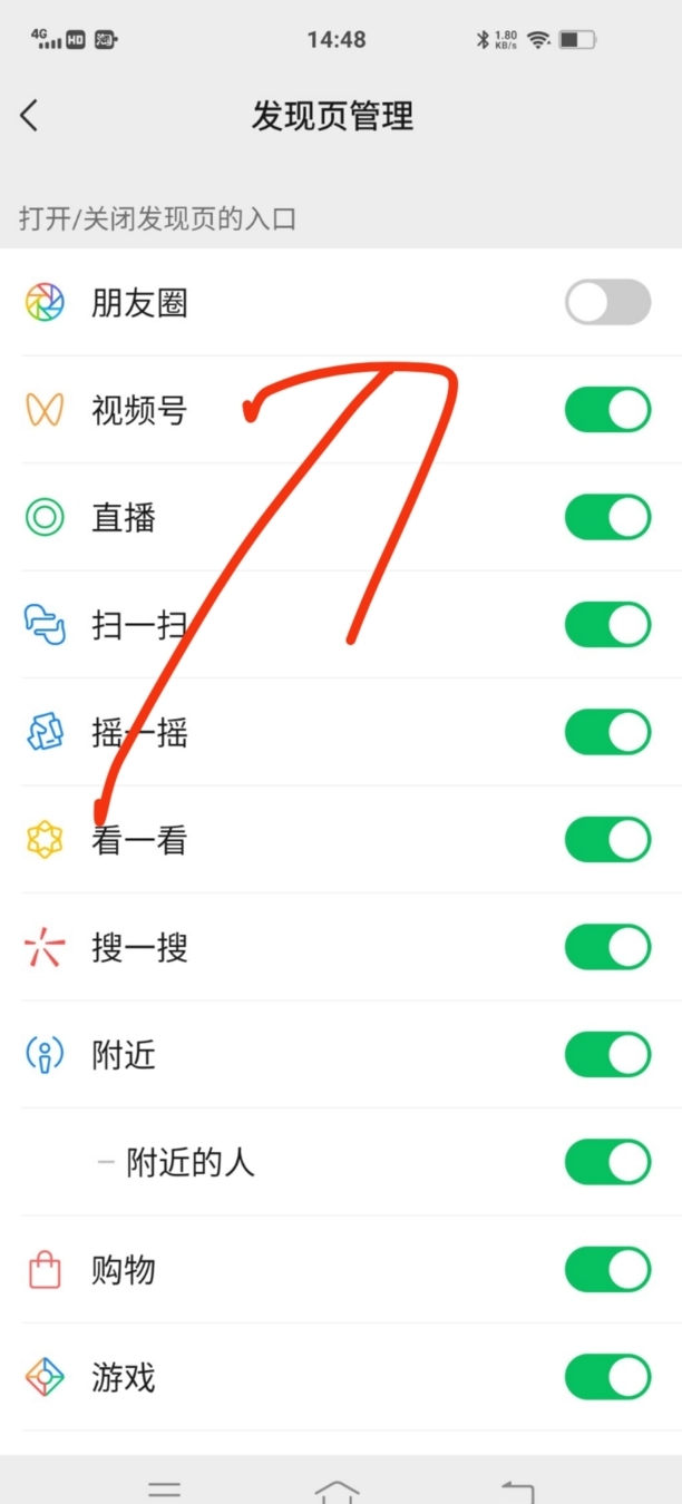5.发现页管理点开来过后,再点击朋友圈加那个按钮开启就可以了