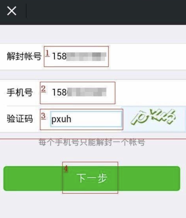 2、正确输入“解封帐号”、“手机号”及“验证码”;点击“下一步”;如图: