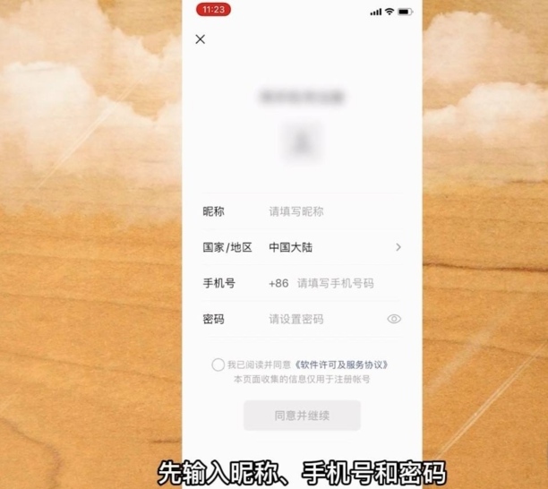 2、先输入昵称、手机号和密码,点击同意并继续。