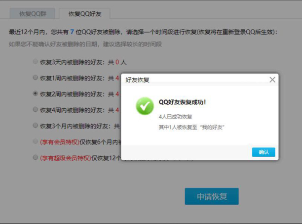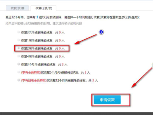 4、选择恢复好友时段,并点击申请恢复。