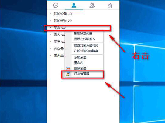 1、电脑端登陆QQ,鼠标右键单击好友分组,并点击好友管理器。
